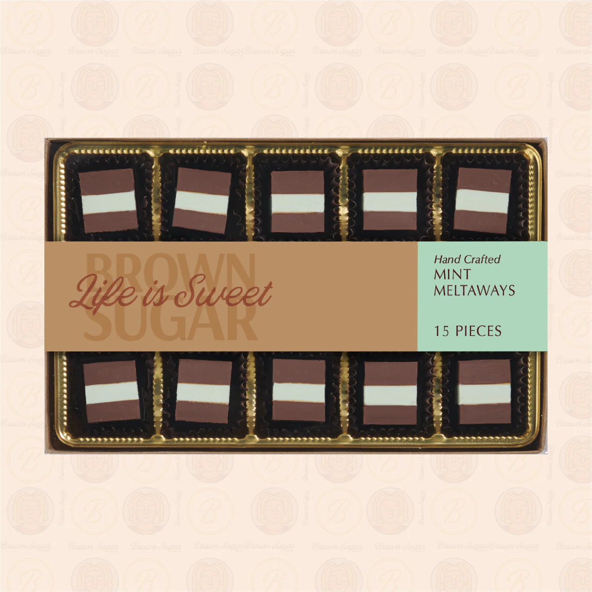 Mint Melt-a-ways. A layer of smooth creamy pastel-green mint chocolate sandwiched between rich dark chocolate.